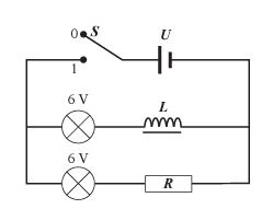 Koppla förslagsvis först in 6V-glödlamporna och spolen ansluten till 1000 varv med järnkärna. Sätt strömbrytaren i läge 1 och vrid upp spänningen så att lamporna lyser med full ljusstyrka. Växla därefter strömbrytarens läge mellan in- och urkoppling av kretsen och därmed in- och urkoppling av spolen. Studera om glödlamporna tänds samtidigt. Om de inte gör det, vilken lampa tänds sist?