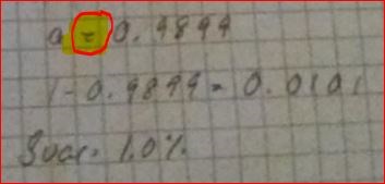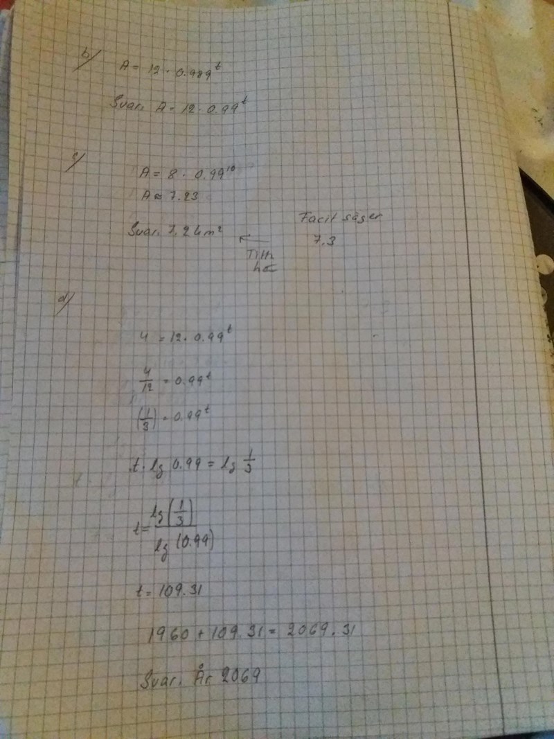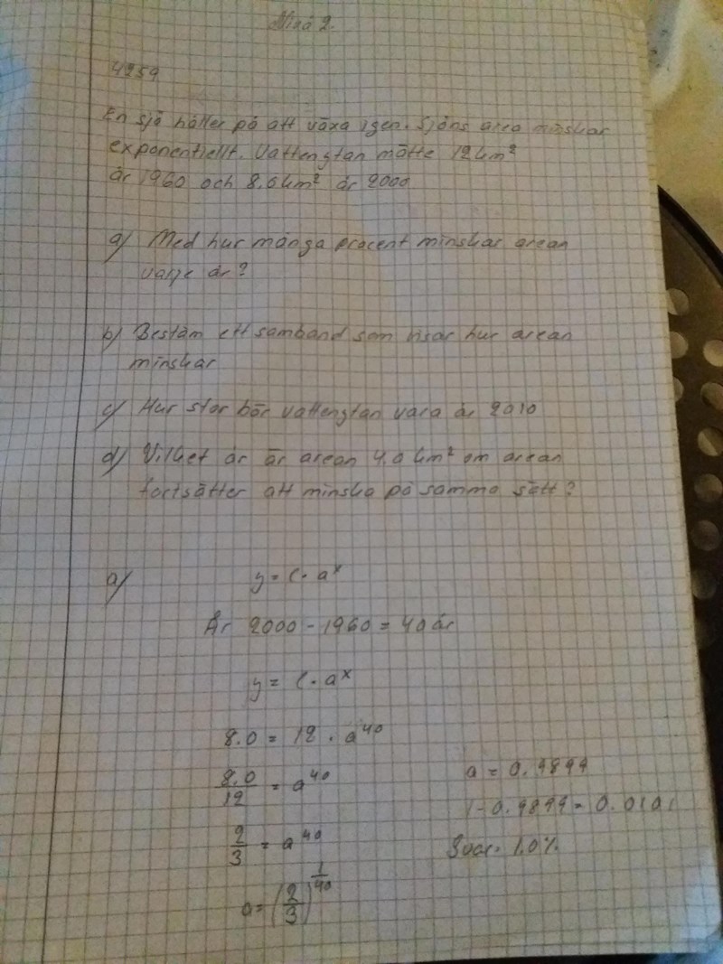 Värdet på a, dvs förändringsfaktorn, är mycket riktigt ungefär lika med 0,98991, vilket innebär att den årliga minskningen är ungefär lika med 1,009 %, vilket kan avrundas till 1,0 % i detta sammanhang (två gällande siffror på sjöns area).