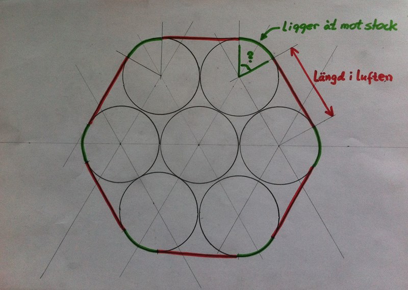 Jag ser att röda sträckan ”längd i luft” motsvarar 2 radien . Dvs om diametern är 20, då är radien 10cm, vi har 2 st radien alltså 20 cm . 20*6= 120 cm