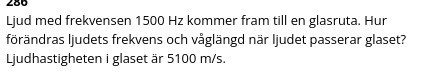 Ljudets hastighet i luft är känt (340 m/s) och du vet sambandet . Frekvensen påverkas inte av att den träffar glaset. Endast våglängd och hastighet förändras.