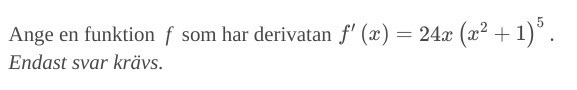 Hej, jag stötte på den här uppgiften och jag ska ta fram f(x) av f'(x). Ska jag då göra det genom att ta fram den primitiva funktionen genom den formeln (glömt vad den heter) eller finns det något annat sätt? Vi har inte kommit till integraler för sammansatta funktioner ännu.