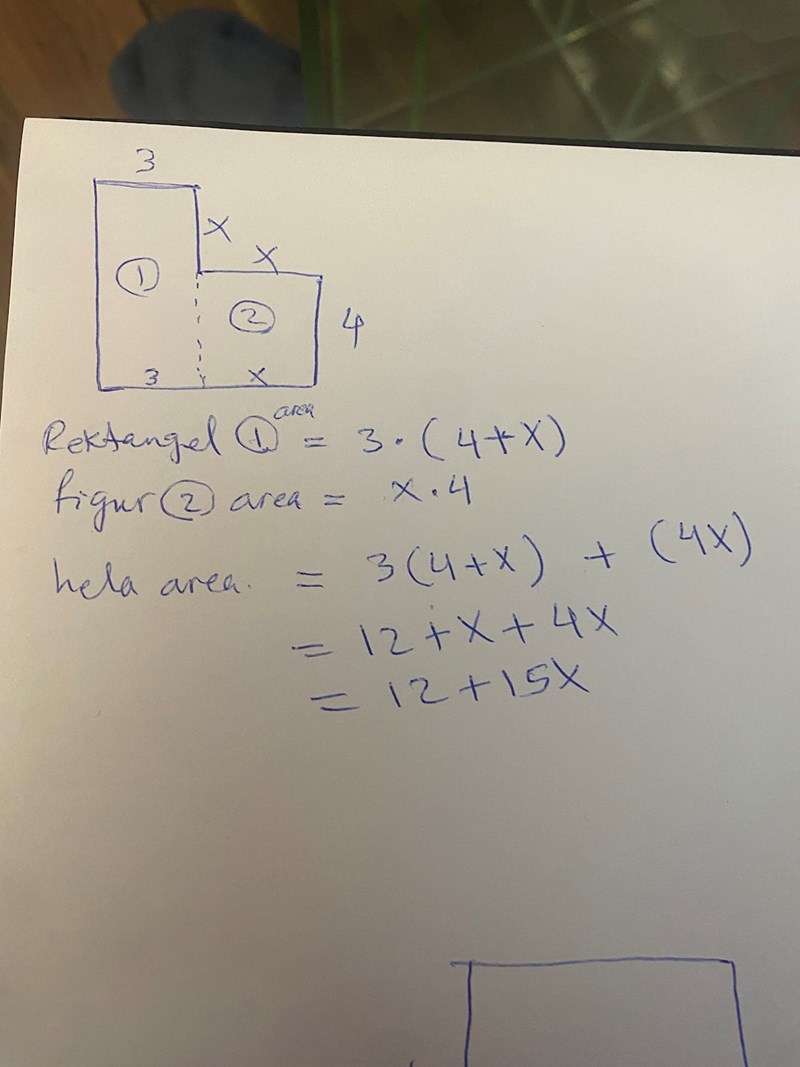 Området är sammansatt av två rektanglar med måtten 3(x+4) respektive 4x, eller 4(x+3)respektive 3x.