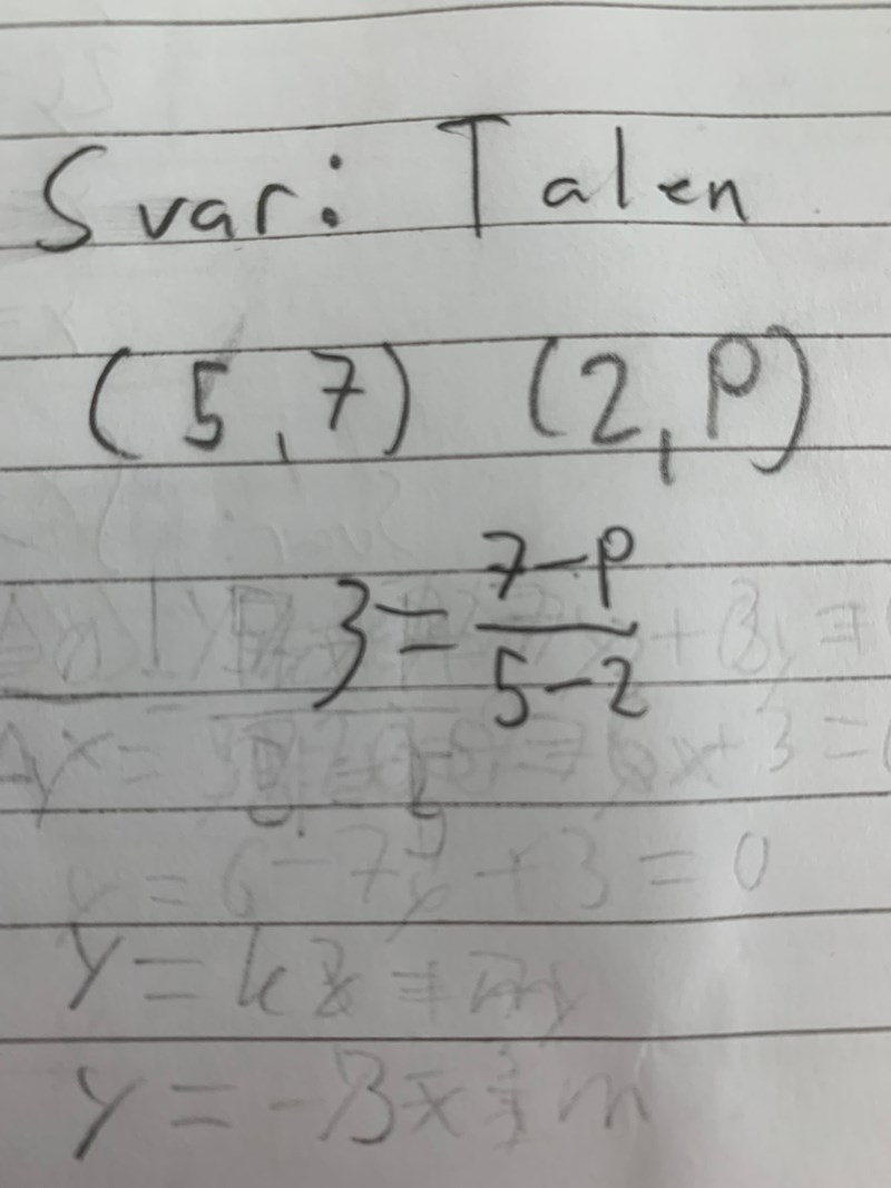 Ska lösa ut p i koordinaterna (5,7) och (2,p). En linje genom 2 punkter har k=3