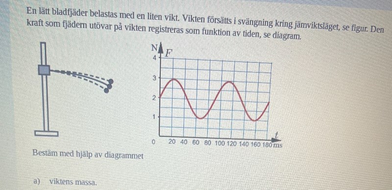 Svängningens amplitud klingar förstås av med tiden och systemet stannar i ett jämviktsläge. Hur ser grafen ut då? Fundera även på i vilket läge kulan är i vid kurvans toppar respektive dalar: högsta, lägsta, eller jämvikt?