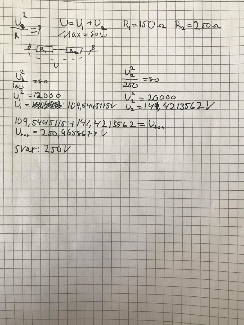 uppgiften: Två resistorer R1 och R2 är seriekopplade. Resistansen hos R1 är 150 och hos R2 är det 250. Var och en av resistorerna får belastas med en effekt högst 80W. Vilken är den största tillåtna spänningen mellan punkterna A och B?