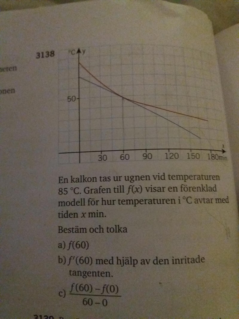 f(60) är alltså kalkonens temperatur 60 minuter efter att den tagits ur ugnen. Det har du redan tidigare bestämt till 50 °C.