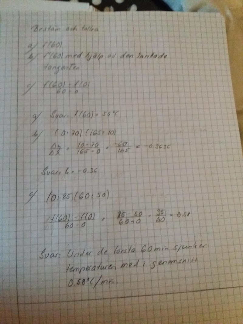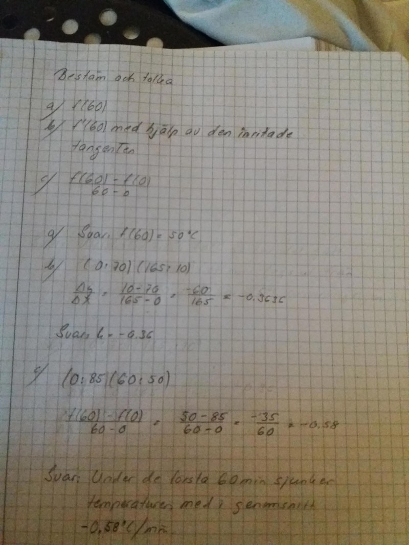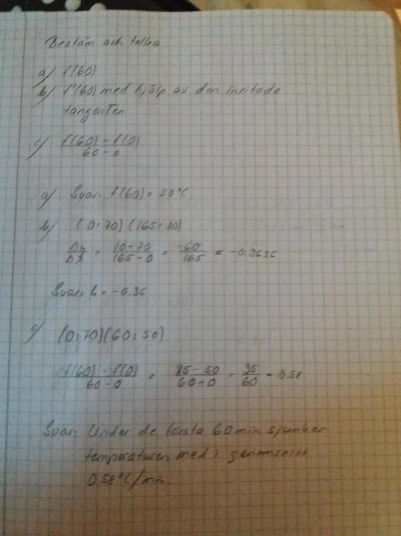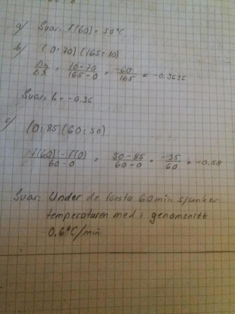 2. Skriv att temperaturen i genomsnitt sjunker med 0,6 °C/minut eller att temperaturen i genomsnitt ändras med -0,6 °C/minut. Om du skriver sjunker så innebär det ju automatiskt en sänkning. Då ska du alltså inte skriva minustecken framför närmevärdet
