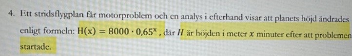 uttrycket 8000*(0,655)-8000*(0,654) = 499 meter villket betyder att detta uttryck är beräknar skillnaden mellan dessa höjder, hur många meter planet sjönk under den femte minuten efter de att mototrproblemen började.