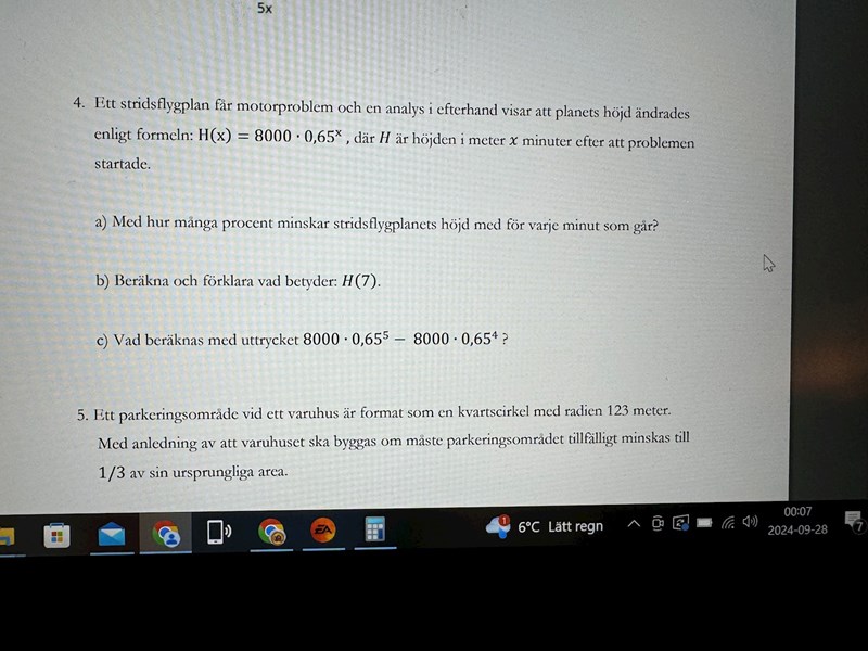 a) jag tänker att om jag multiplicerar 8000*0,65x så får jag 5200, betyder det då att y axeln är 8000 och x axeln är 5200? Och hur räknar jag ut hur många procent stridsplanet minskar för varje minut som går ?