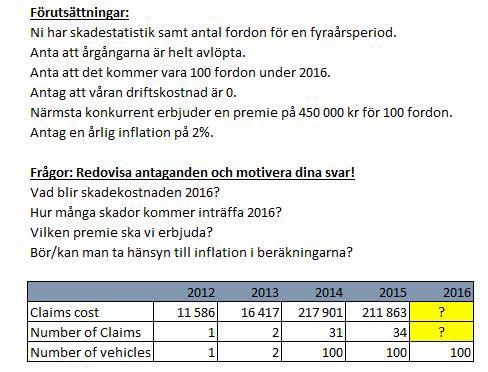I ditt sifferunderlag framgår det inte vilken premie man krävde 2012-2015 eller vilket avkastningskrav man har på en försäkring. 100*4000= 400000kr om man är angelägen om att vinna en försäkringskund som äger 100 fordon.