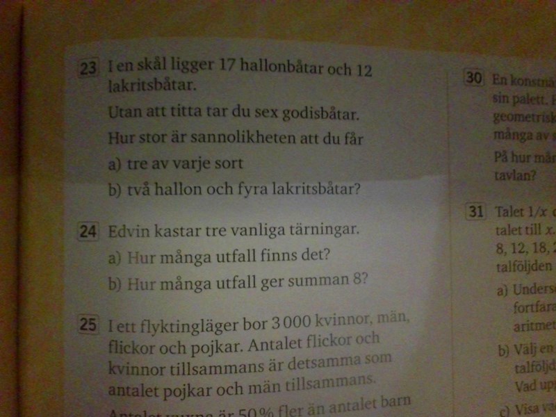 Ja sannolikheten för att man får (tre hallon, tre lakrits) eller (två hallon, fyra lakrits) är enligt facit etthundrafjorton procent!