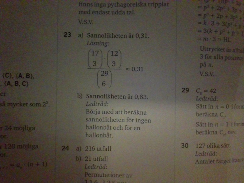I en skål ligger 17 hallonbåtar och 12 lakritsbåtar. Utan att titta tar du sex godisbåtar. Hur står är sannolikheten att du får
