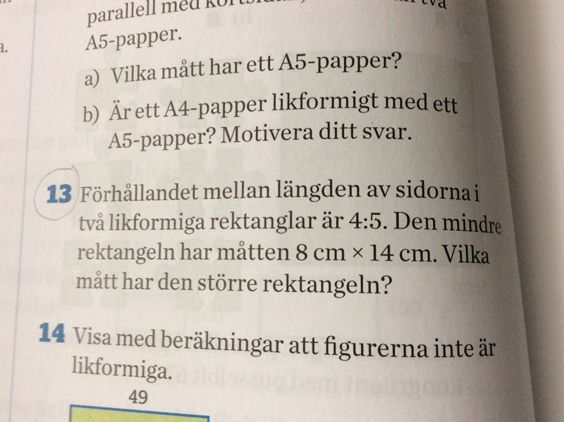 Hej, jag behöver hjälp med uppgift 13. Jag förstår inte deras förhållande. Vad menas med 4:5. Hur ska jag tänka eller räkna då?