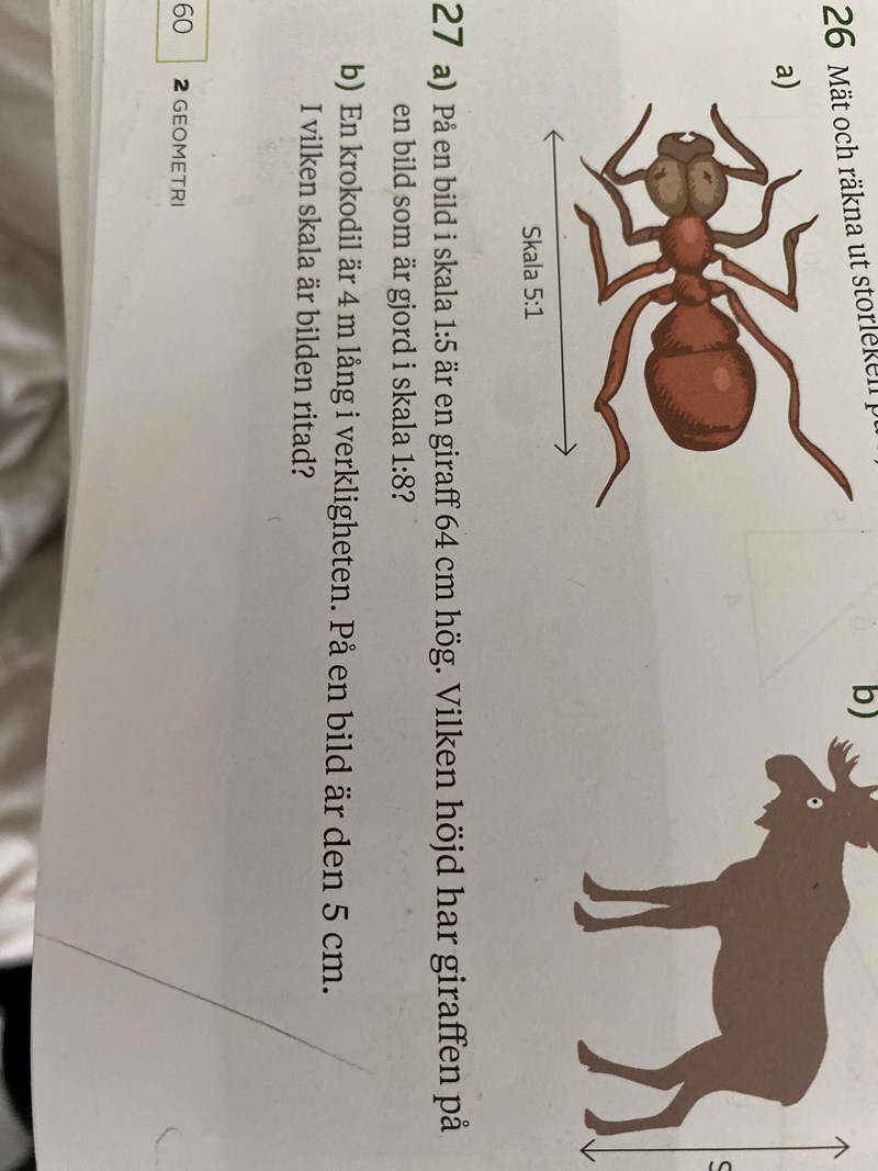 I den första uppgiften ska du beräkna giraffens höjd i verkligheten och beräkna höjden i skala 1:8. I den andra uppgiften ska du beräkna skalan, en bra början är att omvandla krokodilens längd till cm.