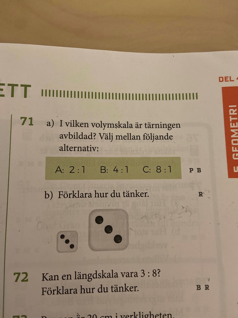 Då är alltså den stora tärningen dubbelt så lång som den lilla, och dubbels så bred och dubbelt så hög. Hur många små tärningar behöver man lägga bredvid (och på!) varandra för att det skall bli lika stort som den stora tärningen?