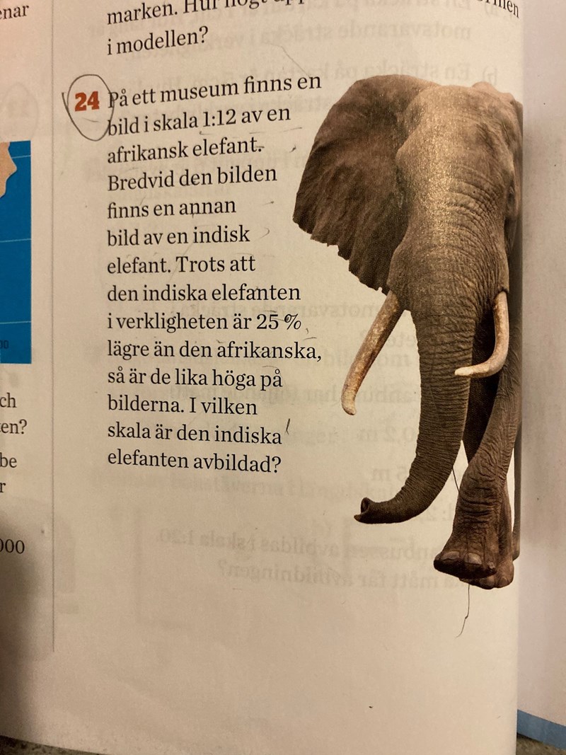 Den indiska elefanten är bara 3/4 storlek jämfört med den afrikanska elefanten (då det står att den är 25%lägre än afrikanska elefanten vilket skulle motsvara att den är 3/4 = 0.75 = 1-0.25 storlek jämfört med a-elefanten)