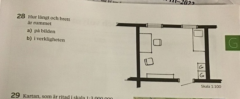 Hej, jag förstod inte riktigt hur jag ska tänka på denna uppgift? 28 a och b. Skalan är 1:100cm