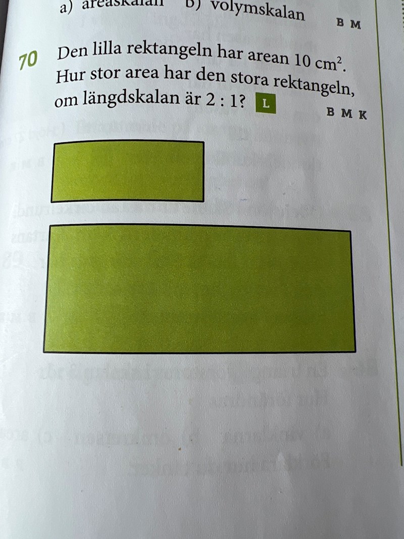 Om skalan är 2:1 så betyder det att den stora rektangeln är dubbelt så bred och dubbelt så lång. Hur många gånger större area har den stora rektangeln?