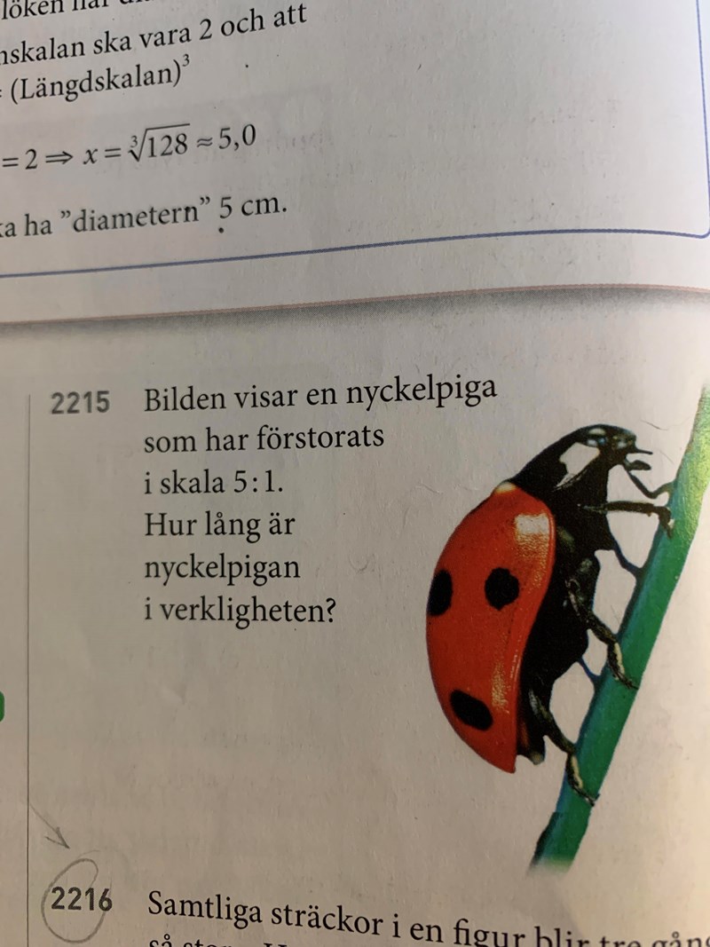 en nyckelpiga förstoras i skala 5:1 hur lång är den i verkligheten? (vill veta om jag tänkt rätt)