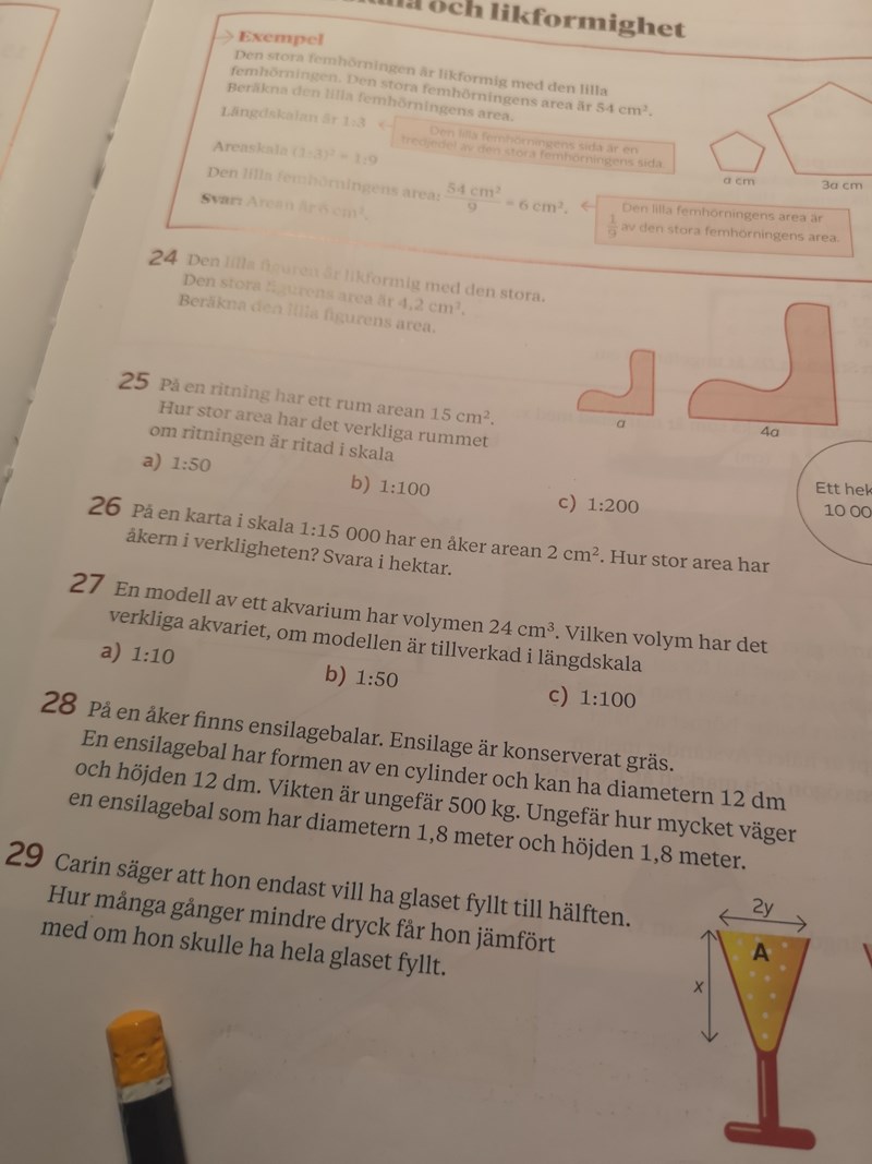 först vill du ta reda på hur mycket större ensilagebalen nummer 2 är än nummer 1. Så du tar 18/12. Det blir 1,5. Kom ihåg att vi behöver använda oss av volymskala så 1,5 upphöjs till 3. Det blir 3,375. Nu multiplicerar du det med 500, 1687. Vilket är typ 1700.