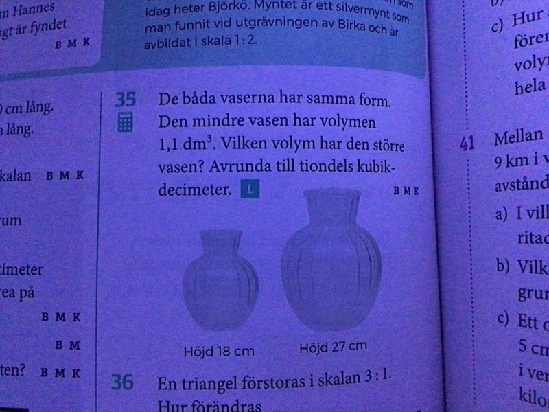 hej, kan nån hjälpa mig med upg 35. jag behöver inte hjälp med att lösa det men jag förstår inte varför uppgiften blir löst så. liksom varför blir Längdskalan 18:27? det är väl bara skalan från verkligheten & på bilden som man skriver så.. och jag fattar bara inte resten av lösningen till uppgiften, kan någon snälla ge en förklaring till varför man löser uppgiften så: