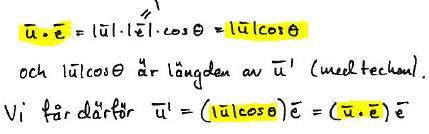 1. Under 7) så pratar man om projektion. Jg var med på vad skalärprodukt är, att om man tar vektorn som går snett uppåt gånger vektorn rakt fram gånger cos av vinkeln emellan dem - och vad man får fram är längden av u'. Men här: u*e= |u||e|cos theta. e=1 ger |u|*1*cos theta. Men så dyker e upp utanför |u|cos theta. Jag tänker först:"okej så istället för att sätta den till 1 har man placerat dem där - men då kommer nästa problem: vad som är kvar inuti parentesen är inte u*cos theta utan u*e så nu är e både innanför och utanför parentesen och jag förstår inte vad som händer med e...