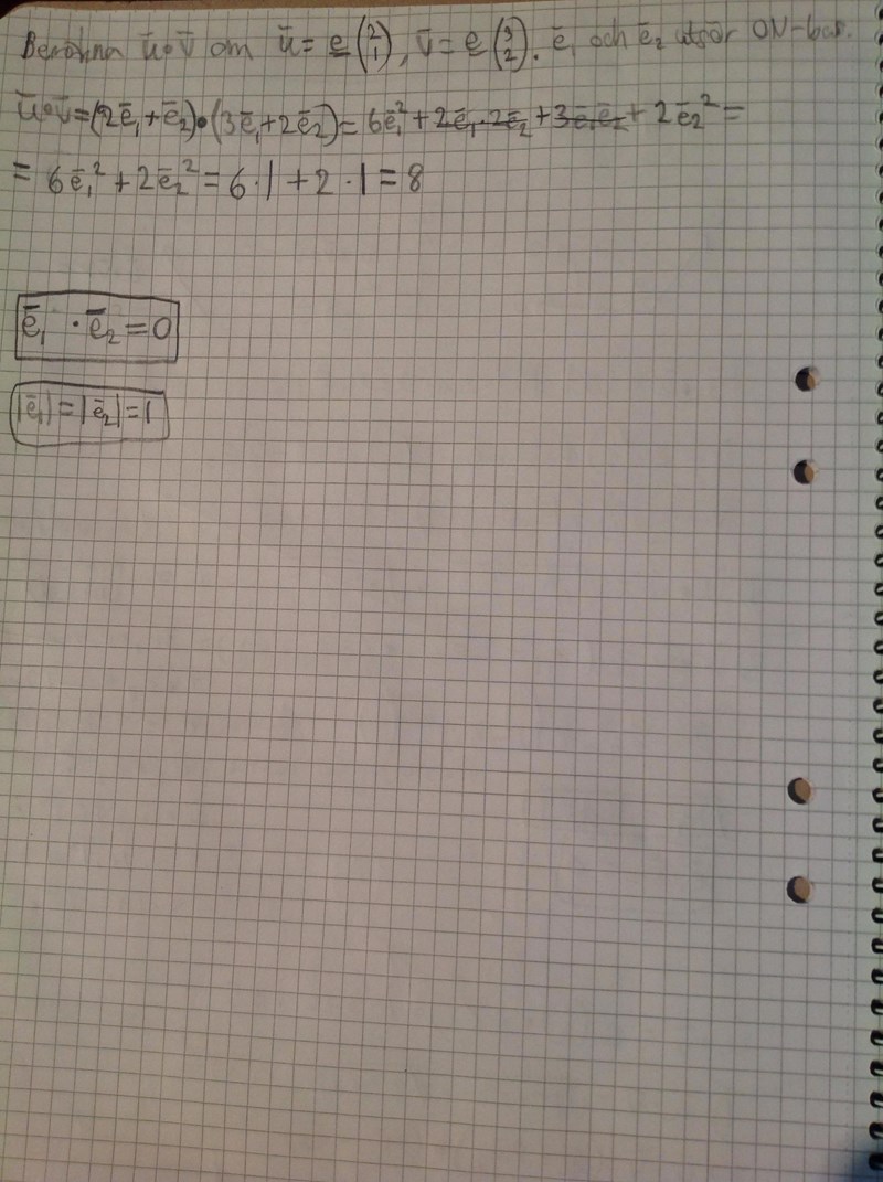 Sedan är e1·e2=0=e2·e1e_1 \cdot e_2 = 0 = e_2 \cdot e_1, eftersom basvektorerna e1e_1 och e2e_2 är Ortogonala (O), och e1·e1=1=e2·e2e_1 \cdot e_1 = 1 = e_2 \cdot e_2, eftersom basvektorerna e1e_1 och e2e_2 är Normerade (N); det ger skalärprodukten