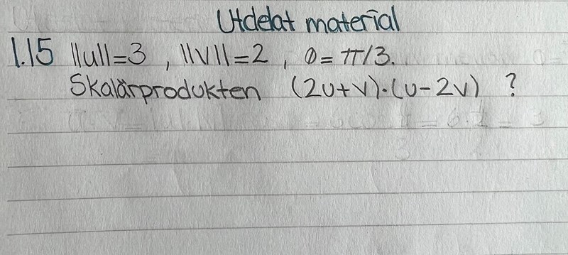 Hej, jag har följande uppgift att lösa i boken Linjär Algebra - Övningar. Jag kan reglerna för en skalärprodukt, dock vet jag inte hur jag ska lösa en sådan uppgift. Tacksam för hjälp. Svaret ska bli 1 enligt facit.
