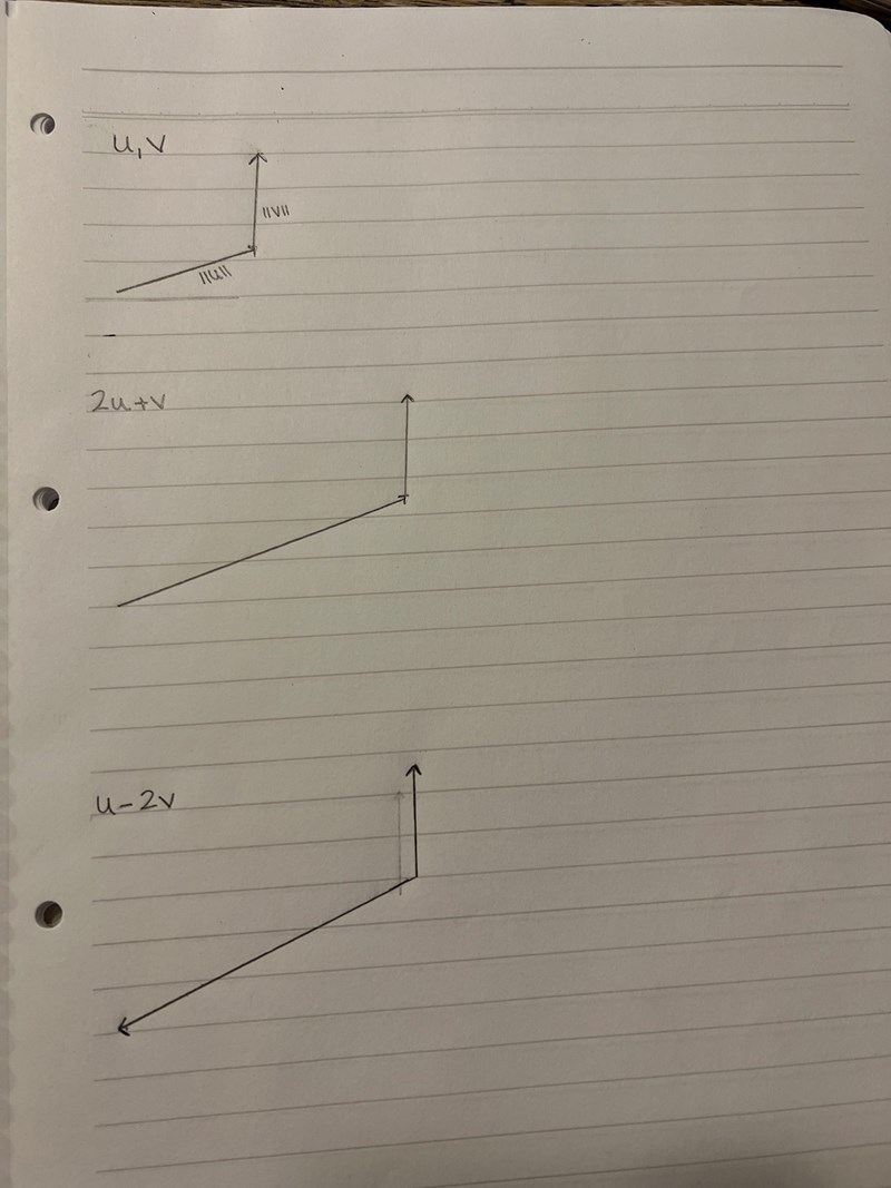 Bra start, men du har inte ritat upp 2u+v eller u-2v än. Gör det! (du har ritat upp  vektorerna 2u och v i den ena bilden, u och -2v i den andra)