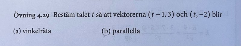 Ett annat sätt att lösa uppgiften är att använda ditt resultat från den första uppgiften. En vektor som är vinkelrät mot är . Om uppgiftens två vektorer är parallella måste den vinkelräta vektorn också vara vinkelrät mot den första vektorn . Det låter dig lösa ut ett värde på :)
