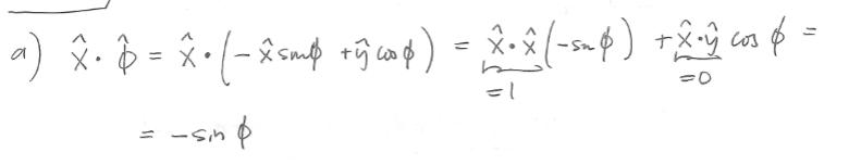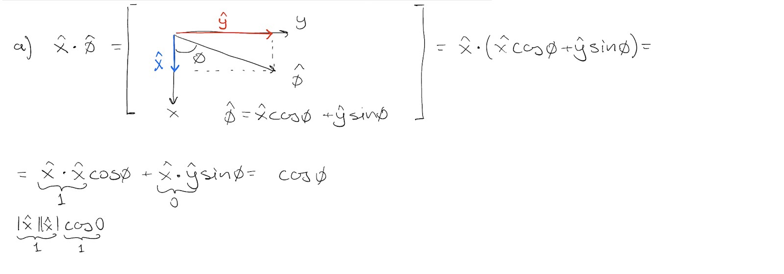 Vad du kan tänka på är att skalärprodukten mellan två enhetsvektorer helt enkelt är cosinus av vinkeln mellan vektorerna. Vinkeln mellan är och vinkeln mellan är . Därav följer resultatet.