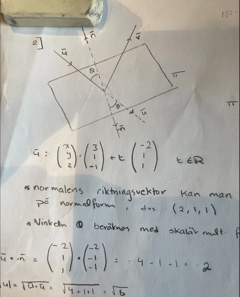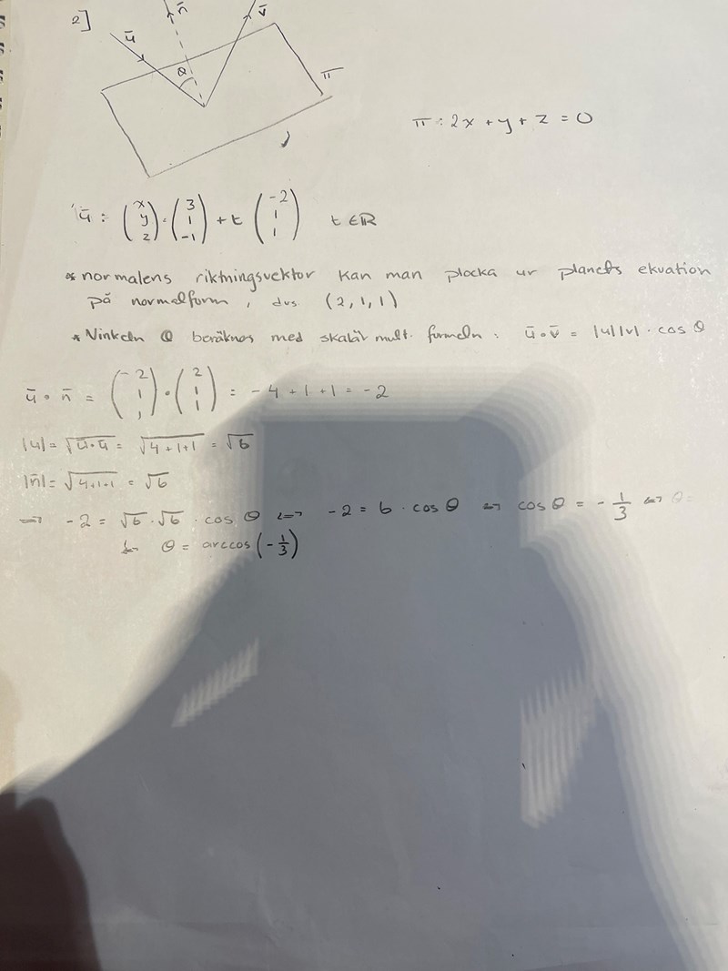 du ser ju i bilden ovan, jag är ute efter vinkeln mellan den röda linjen som jag har döpt till v, och normalen som jag döpte till n, normal vektorns riktning(uppåt) kan vi ta från planets ekvation 2x + y + x = 0 dvs. normalen har riktningen (2,1,1). sedan tänker jag att jag byter riktningen på normalen så jag får den normalen som går genom planet till undersidan och sedan räkna skalär produkten, blir det rätt på detta sätt?