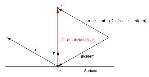 "I reflexionen byter strålen tecken i normalens riktning, men är oförändrad tangentiellt med planet. Du vet strålens riktning in och ut, vilket ger normalens riktning. "