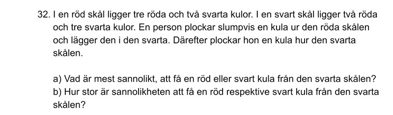 jag vet inte hur jag ska beräkna sannolikheterna på b). Jag vet ju inte vilken kula som som hamnar i den svarta skålen. Kan någon förklara hur man ska göra? Tacksam för svar :)