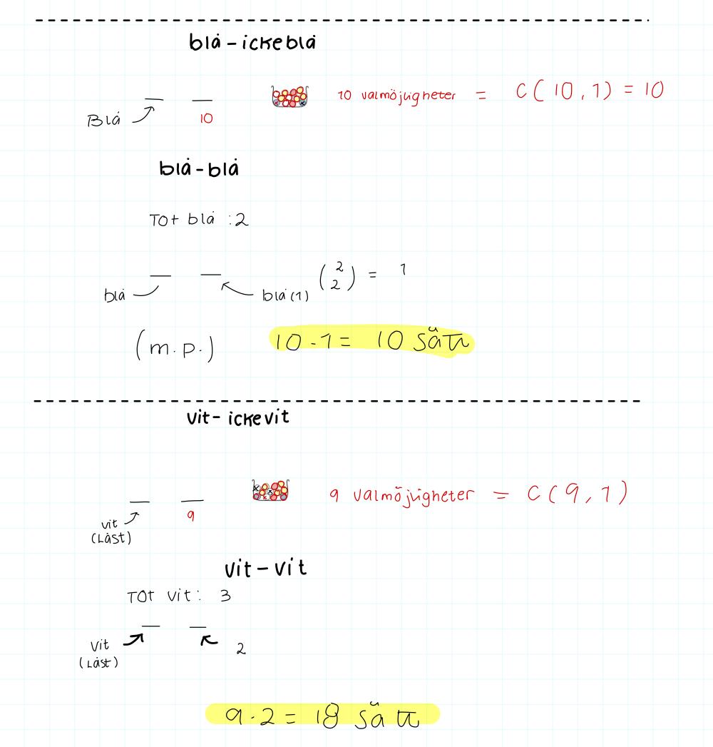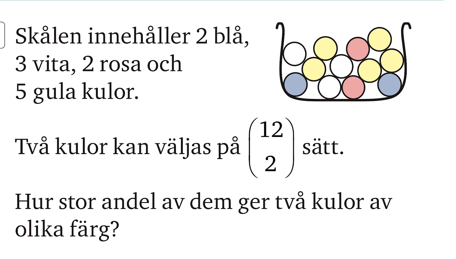 totalt 109 106, mer än antalet olika val av två kulor som är 66. Men nu har vi räknat t ex gul+rosa som ett annat fall än rosa+gul, det är därför det blir alldeles för många möjligheter.