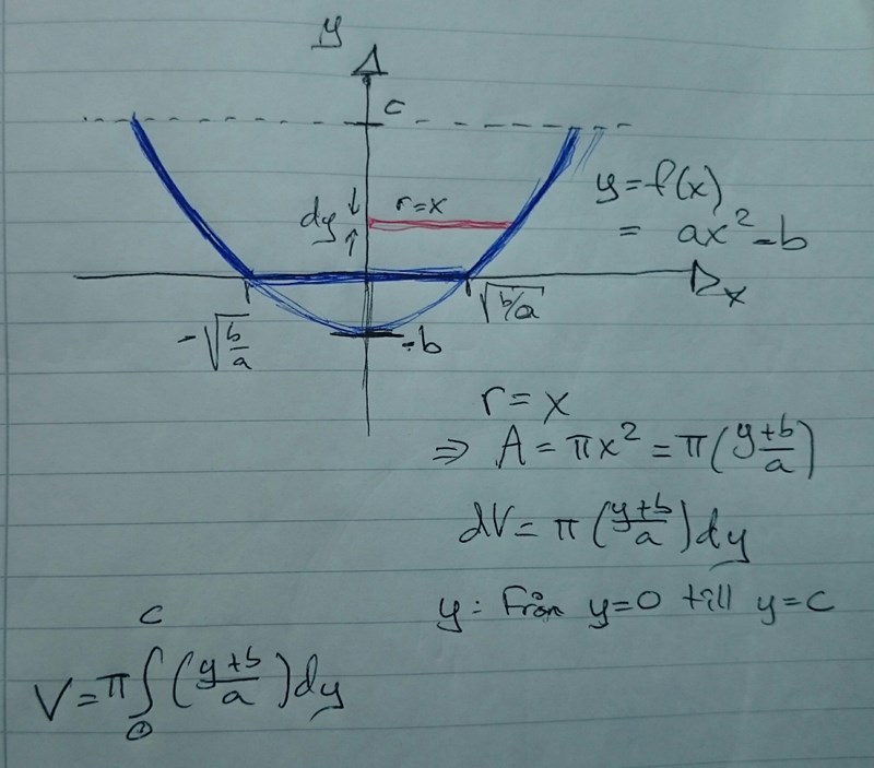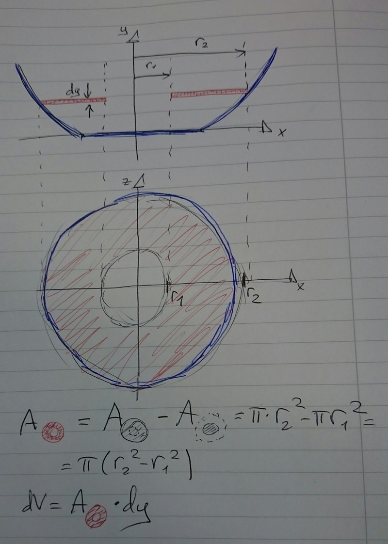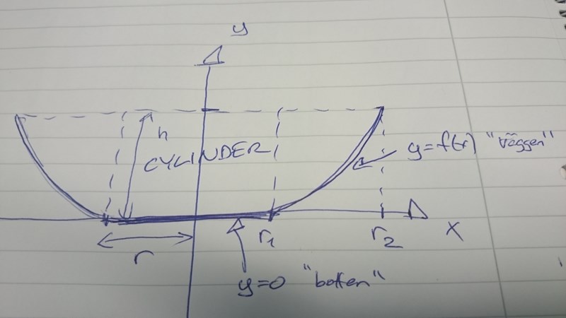 Om du kan hitta ett samband y = f(x) som beskriver skålens form även under x-axeln så kan du välja en enklare lösningsmetod, skippa cylindern och skivorna med hål i mitten.