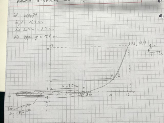 Eftersom det är det halva av skålen som ritas, så har jag delt bottens och öppningens diametrar med 2. Det skuggade området är cylindern med volymen h = 11,3 = 641,2 = 0,612 liter