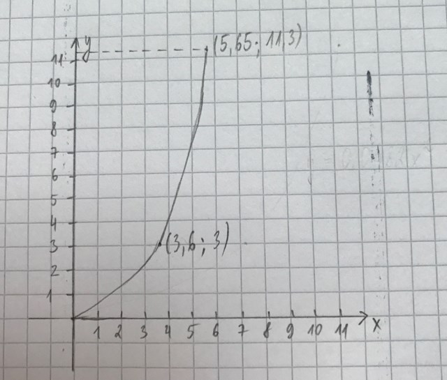 Jag har också antagit att kurvan än en y = C kurva och räknat mig fram till att konstanten C = 11,3/5,65^2 = 0,3539. Så funktionen blir då y = 0,3539