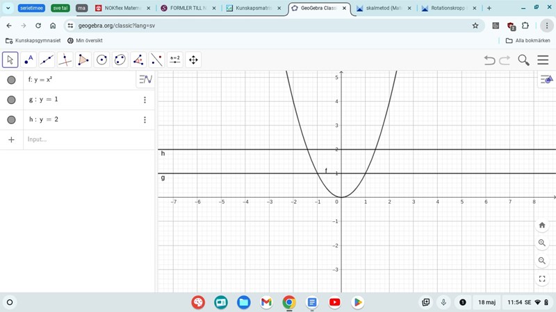 Okej så om vi tänker "Bestäm volymen av den kropp som bildas då området som begränsas av y = x^2 och y = 1 roterar kring linjen y = 2." ska jag då flytta ner grafen 2 steg för att få rotation kring x-axeln ist, så då får jag y=x^2 -2 och x blir x=roten ur (y-2) och rotationsgränserna flyttas ned 2 steg alltså, blir det från y=-1 till y=-2 och sedan så löser jag rotationsvolymen med hjälp av formeln y=2pixy där x=roten ur (y-2)