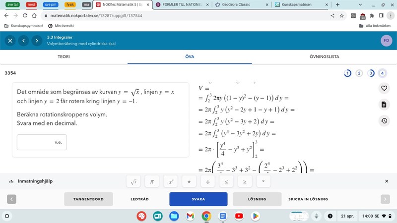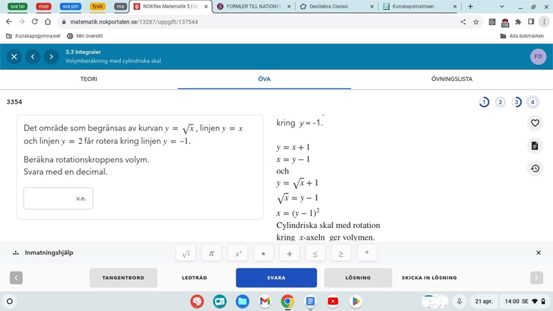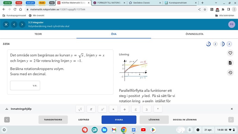 och rotationsgränserna flyttas ned 2 steg alltså, blir det från y=-1 till y=-2 och sedan så löser jag rotationsvolymen med hjälp av formeln y=2pixy där x=roten ur (y-2y-2