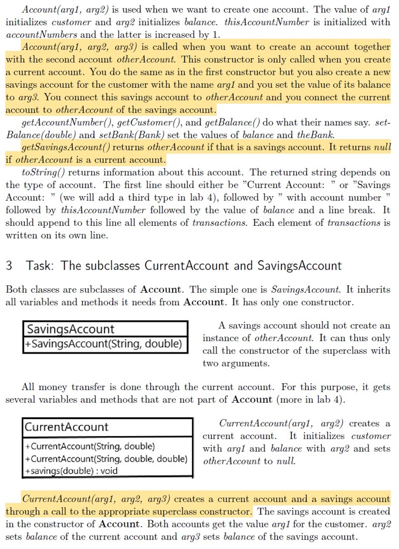 Hade helst även sett instruktionerna för den första constructorn kompletta instruktioner, men meningen är att du ska skapa två konton när den andra (som tar tre argument) används. arg1 är kundens namn för båda. arg2 är saldo för första och arg3 är saldo för andra. Det andra kontot ska vara ett SavingsAccount. Sen ska du se till att båda dessa konton är varandras otherAccount.
