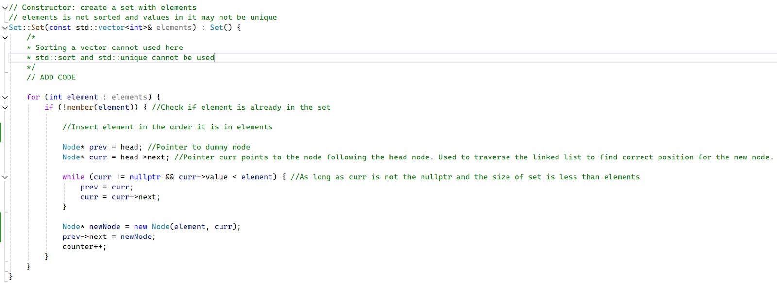 Hej, jag övar till en tenta i C++ och en stor del är just pointers. En uppgift är att skapa ett Set (en singly linked list) från en osorterad array. Jag får in en array genom pass by reference från en annan fil. Jag har inte jättebra koll på pekare och skulle uppskatta lite vägledning kring funktionen. Min default constructor består av en dummy node.