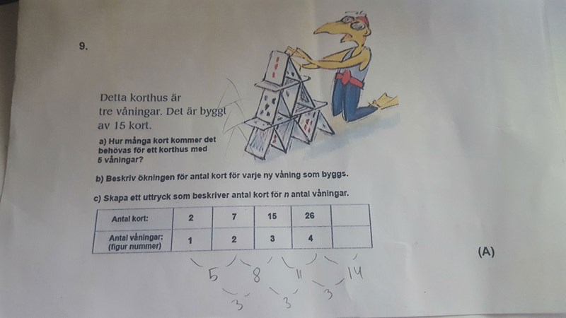Du kan ju tänka som så att för varje ny våning behöver du de kort du redan har + extrakorten för föregående våning igen + tre ytterligare: