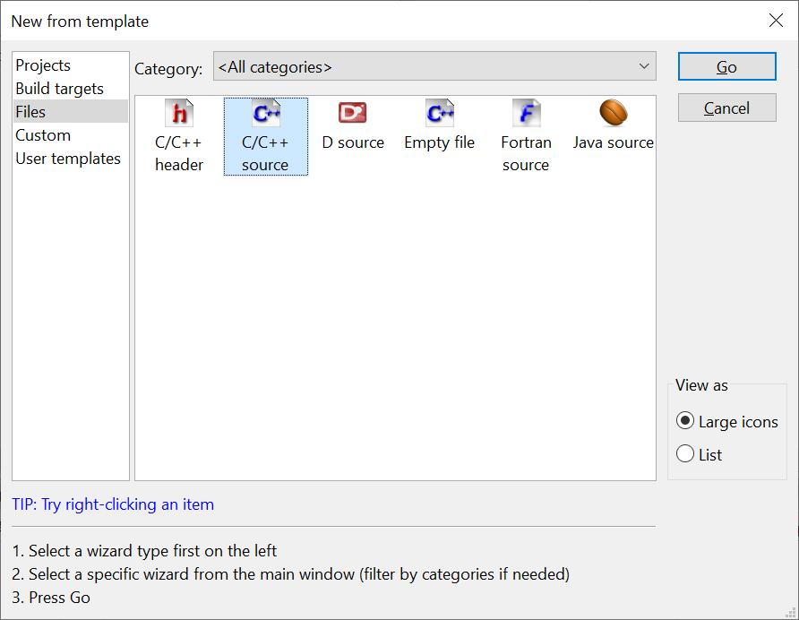 Välj File --> New --> File... --> C/C++ source (för kod som ska exekveras) eller C/C++ header (för konstanter och definitioner som ska kunna refereras till) ...