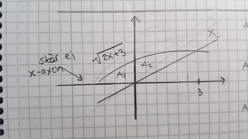 Var det inte möjligen så att du försökte hitta en skärning mellan y=2x+3y=\sqrt{2x+3} och y=xy=x, förutom lösningen x=3?
