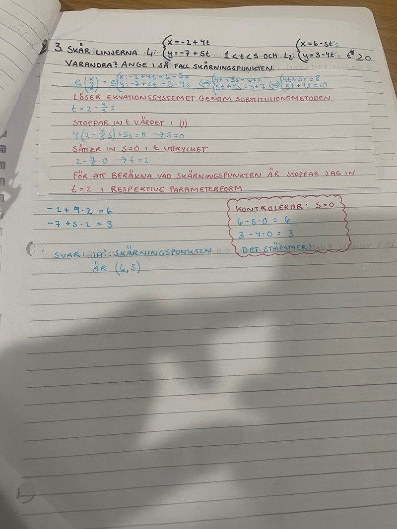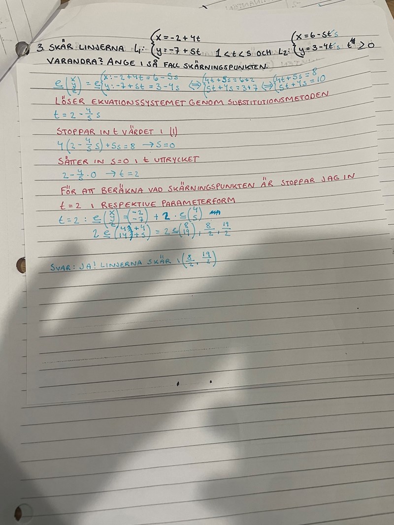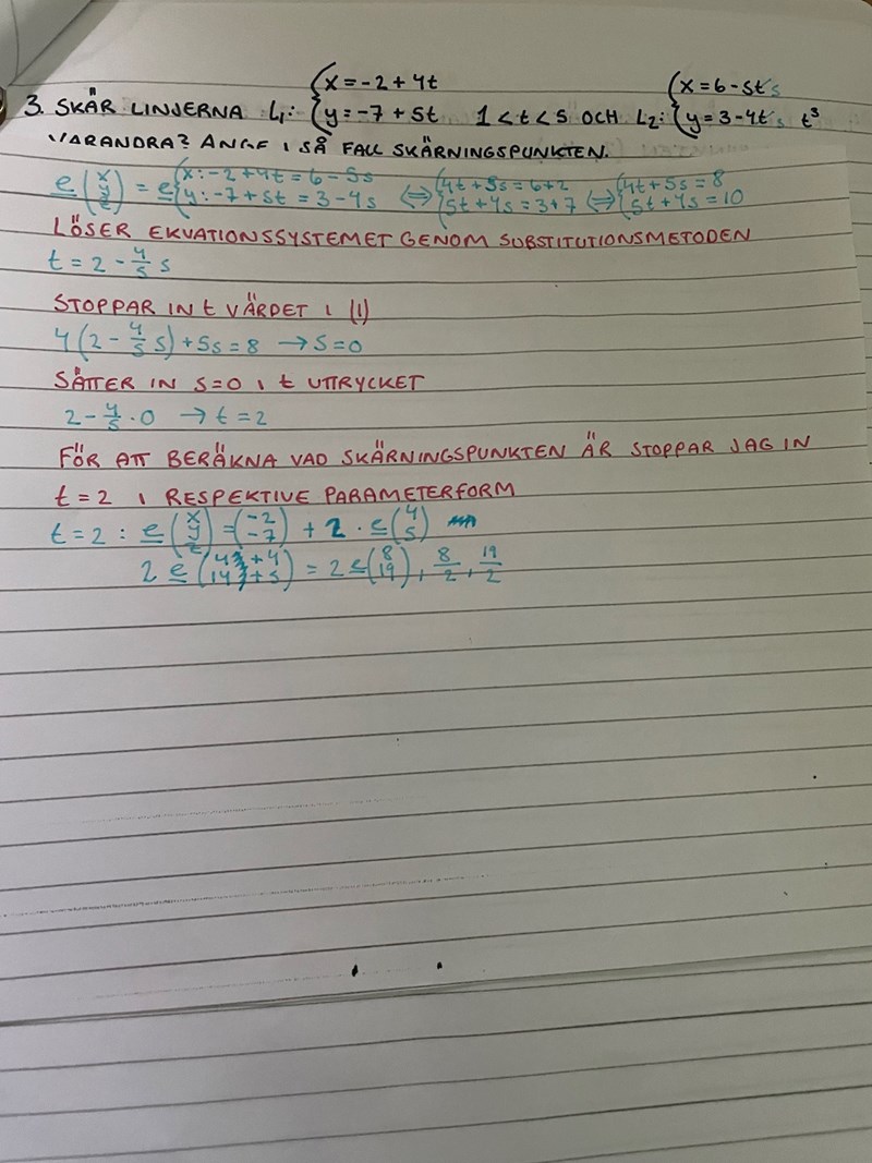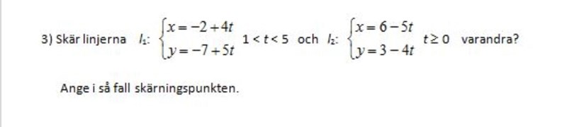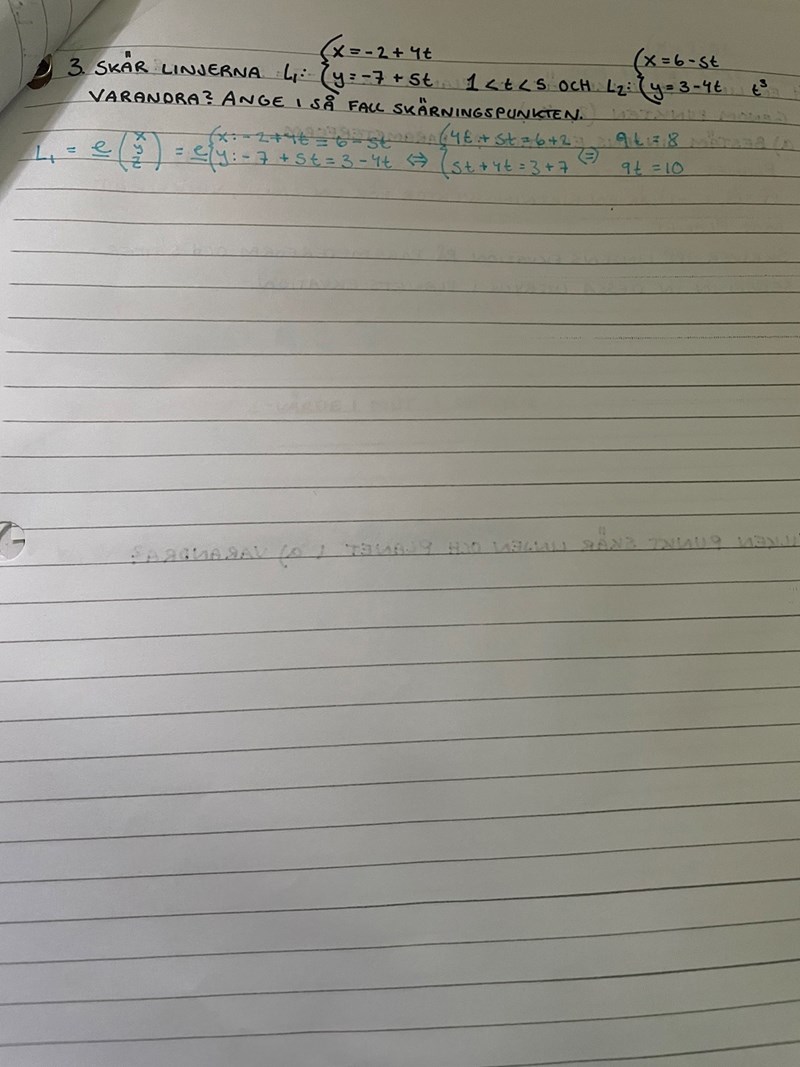 Ska du inte införa s som parameter för den andra linjen, som du gjorde i en annan uppgift? Man kan inte räkna med att t har samma värde för båda linjerna om/när de skär varandra.