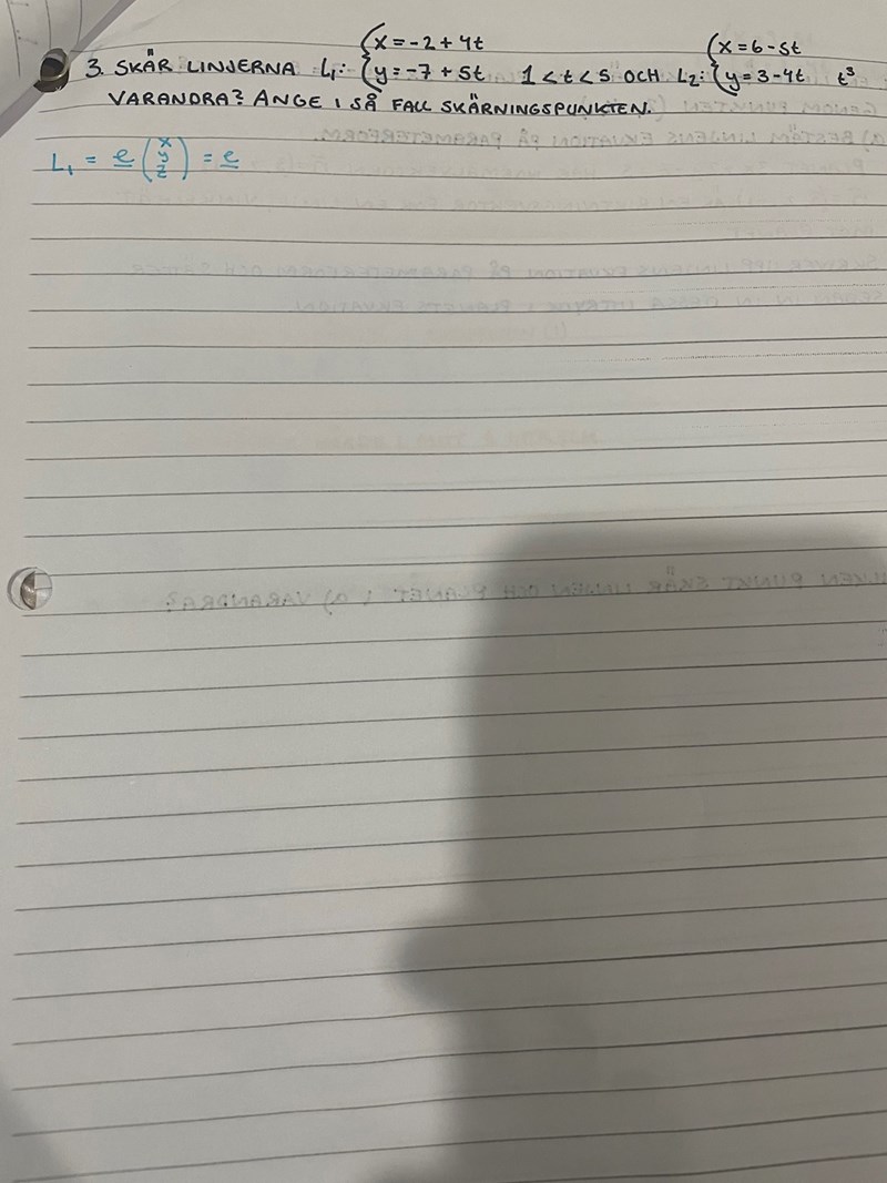 Jag förstår hur man ska göra på denna, först skriva på parameterform, sen som ett ekvationssystem och sen stoppa in ett av värdena i ev av linjerna. Men hur skriver man en linje på parameterform från detta? Dels är ju inte z med och dels förstår jag inte vart vilka siffror går.