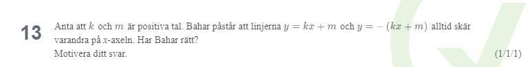Min lärare sa att: Om k = 0 och m = 0, blir den ena linjen y = 0 och den andra också y = 0. Dessa linjer har oändligt många skärningspunkter på x-axeln, de skär alltså alltid varandra på x-axeln, precis som det står i frågan. Men detta har ju jag också kommit fram till i min lösning, eftersom skärningspunkten ges av x = (-m/k) och y = 0.