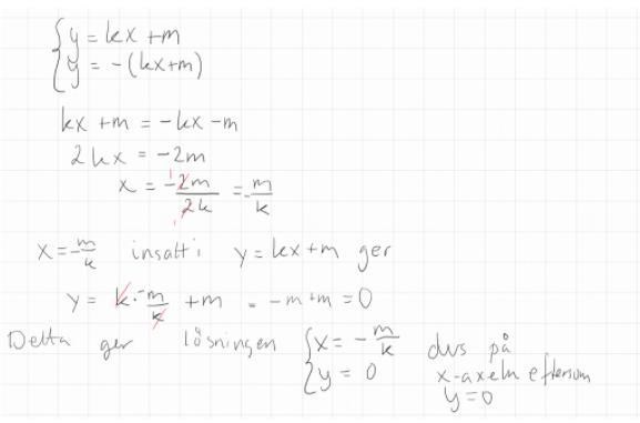 Men det är väl en trivial lösning, alla linjer skär väl varandra om k=m=0. Jag tror man endast bryr sig om lösningen då y=0 och k och m är okända.