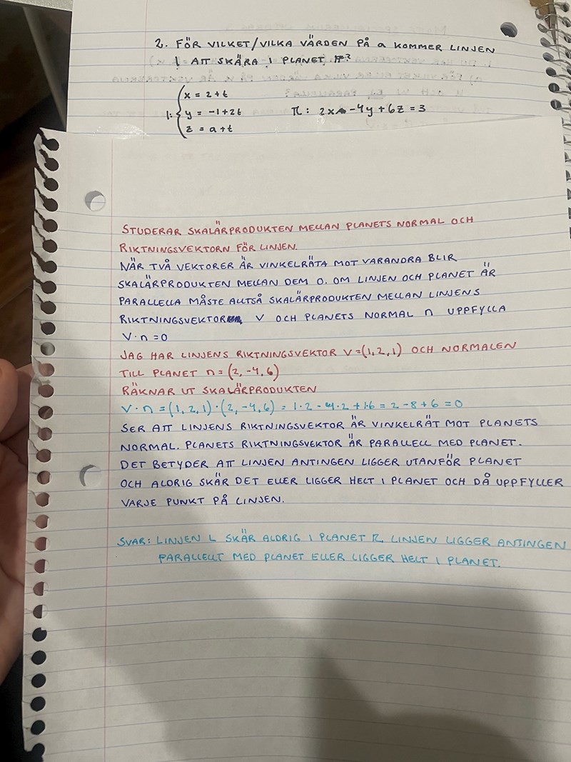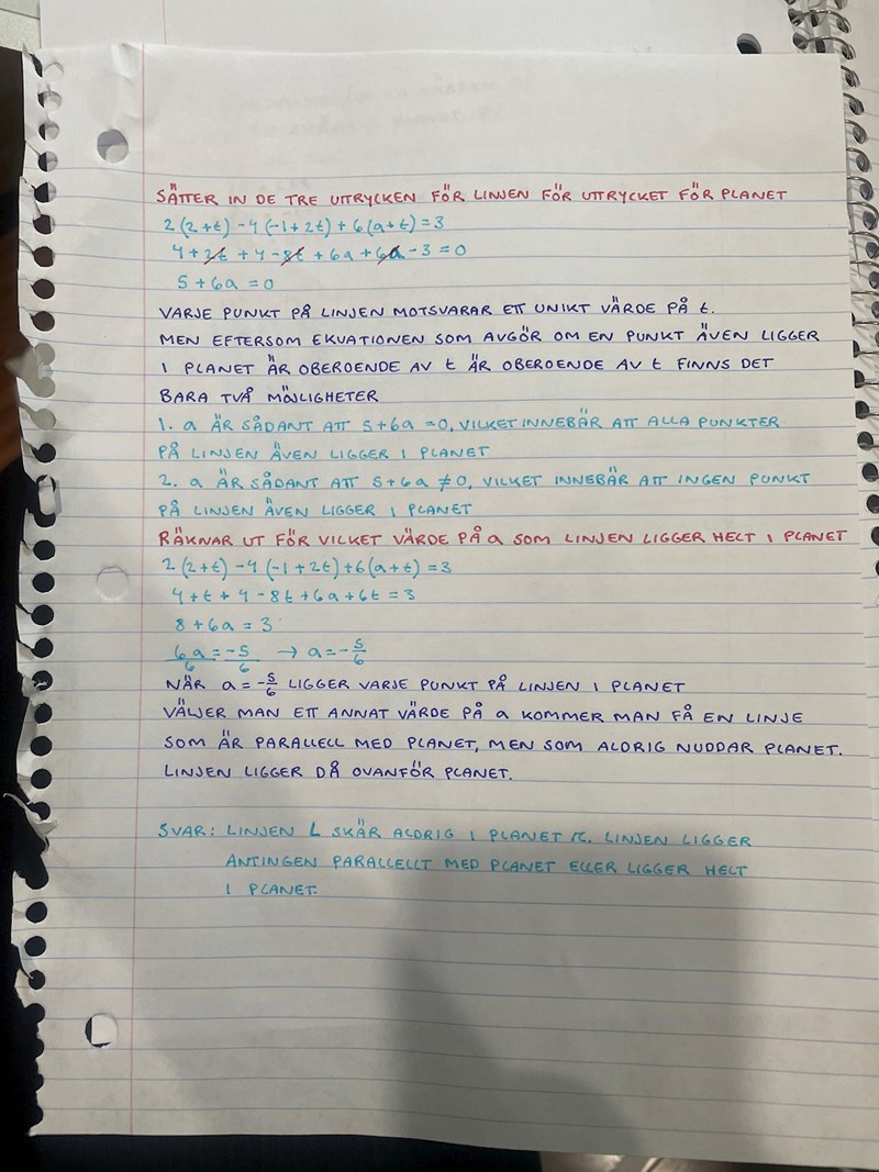 2. a är sådant att 5+6a0, vilket innebär att ingen punkt på linjen även ligger i planet